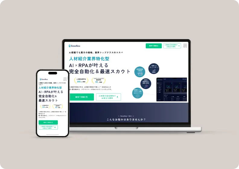 「Scoutless」は、人材ビジネスを展開する企業様向けに設計されたAI×RPAスカウト自動化サービスです。候補者の経歴やスキルをAIが解析し、最適なスカウト文面の生成から送信までを24時間自動化。スカウト業務の工数削減と返信率の最大化を同時に実現します。業務の自動化によって、キャリアアドバイザーや営業担当者はより戦略的な活動に集中でき、人材獲得の成果向上と採用プロセス全体の効率化に貢献しています。